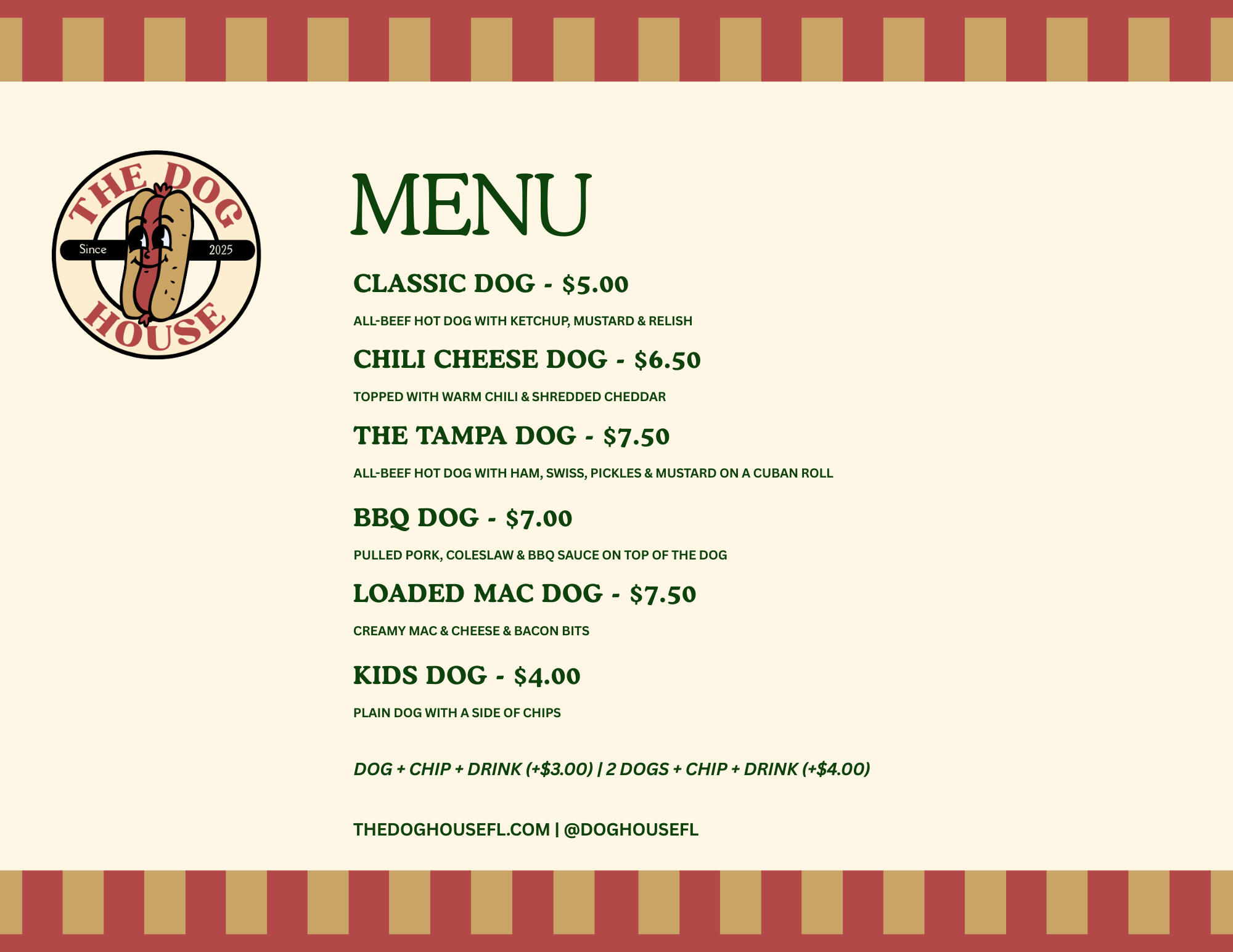 🌭 Hot Dogs • Combos • Sides The Dog House FL is officially launching soon! Follow us on social media or email us for event bookings and updates.